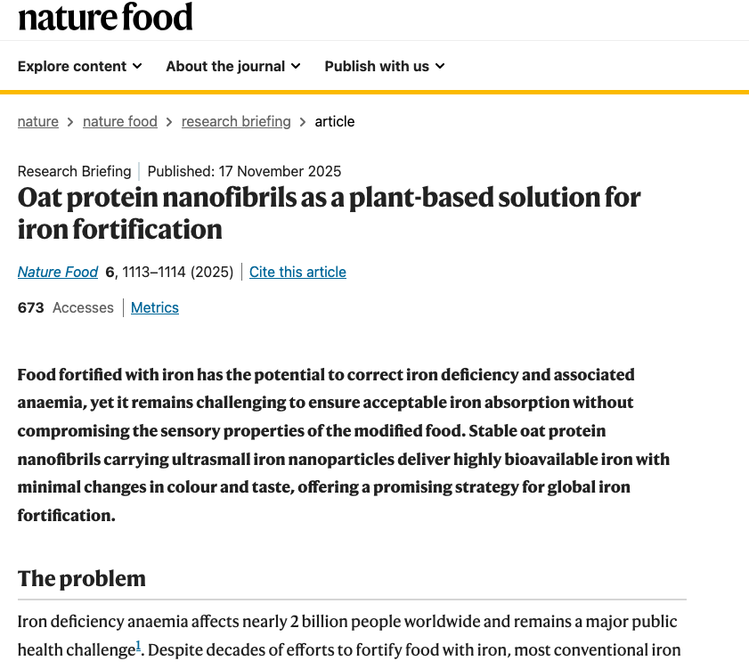 Our work on oat protein nanofibril - iron hybrids for conbating iron-deficiency anemia highlighted by Nature Food Research Briefing.