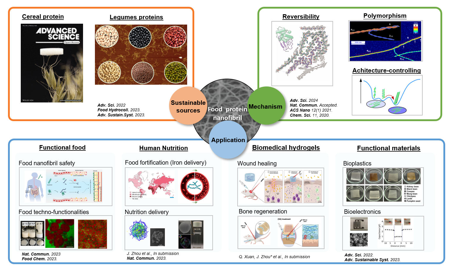 Our team particularly focus on the natural sustainable proteins from plant, sea-products and industrial by-products, and investigate the fundamental mechanisms of protein self-assembling into protein nanofibrils, including their intrinsic properties, novel self-assembling behaviors, and interactions with other bioactives. Besides, we are also interested in natural biopolymers including polysaccharide, cellulose and silk-fibroin.